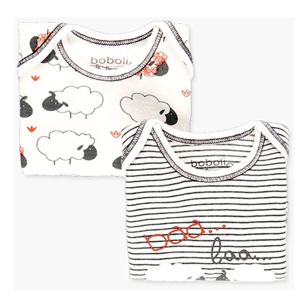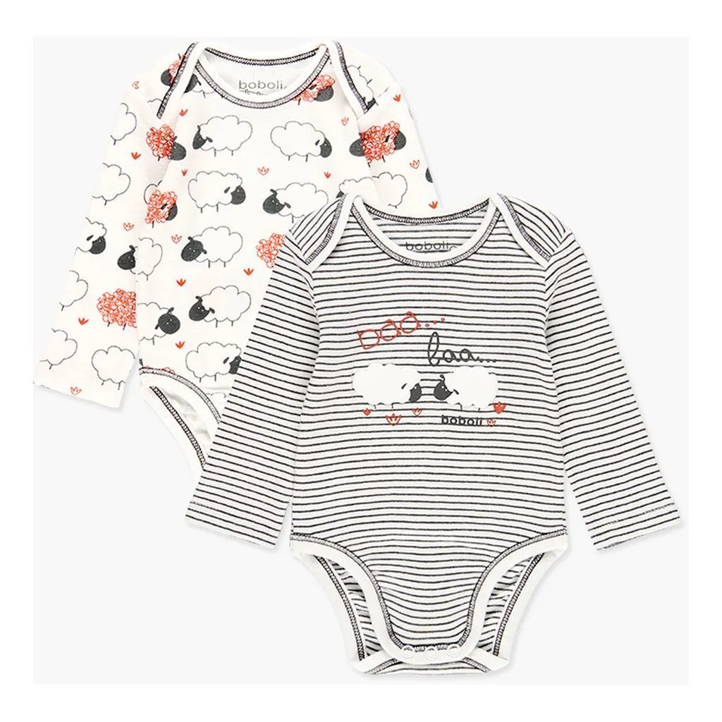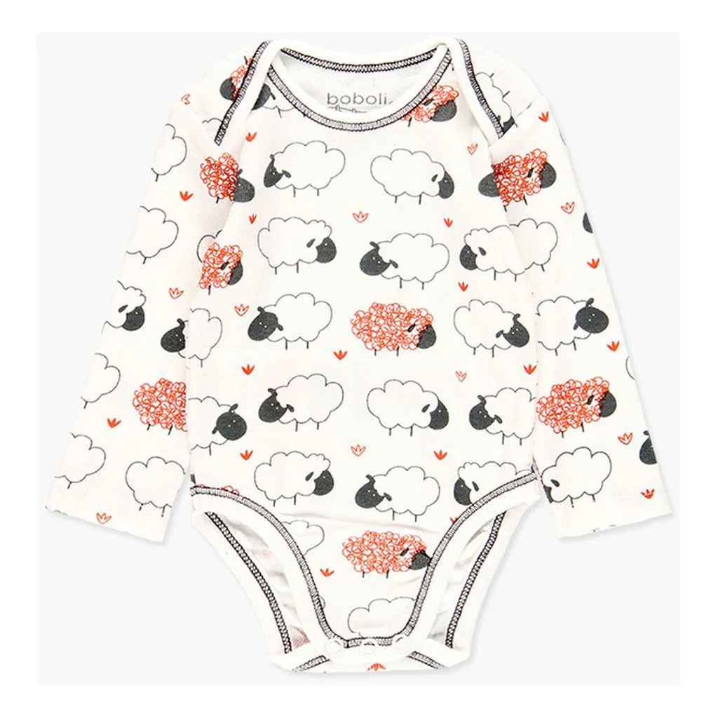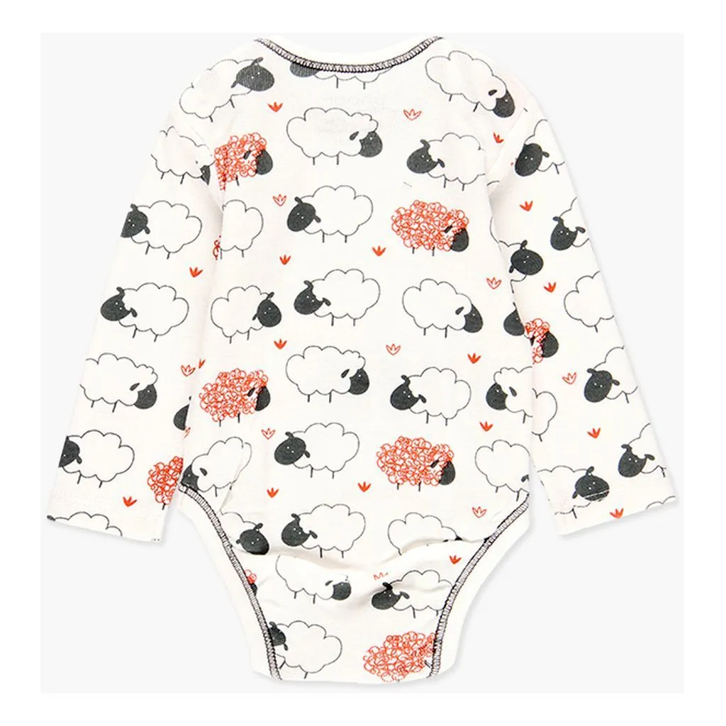 Furthermore, the second bodysuit in the set is a brilliant white, adorned with an adorable sheep print. Moreover, This design is equally charming and perfect for everyday wear or special occasions. Additionally, Like the first bodysuit, it also features a hook fastening, providing ease of use for parents. Both bodysuits are of soft, comfortable materials that are gentle on a baby’s delicate skin. This ensures maximum comfort throughout the day.