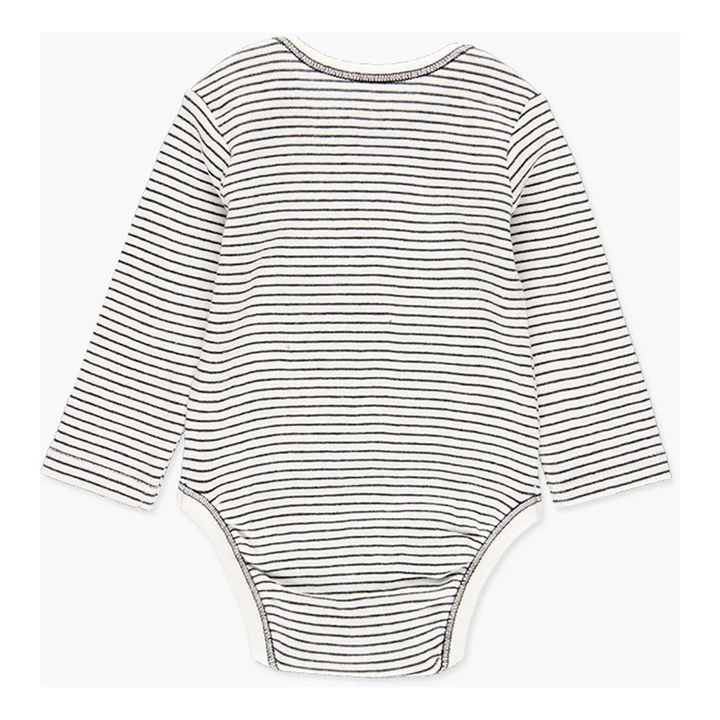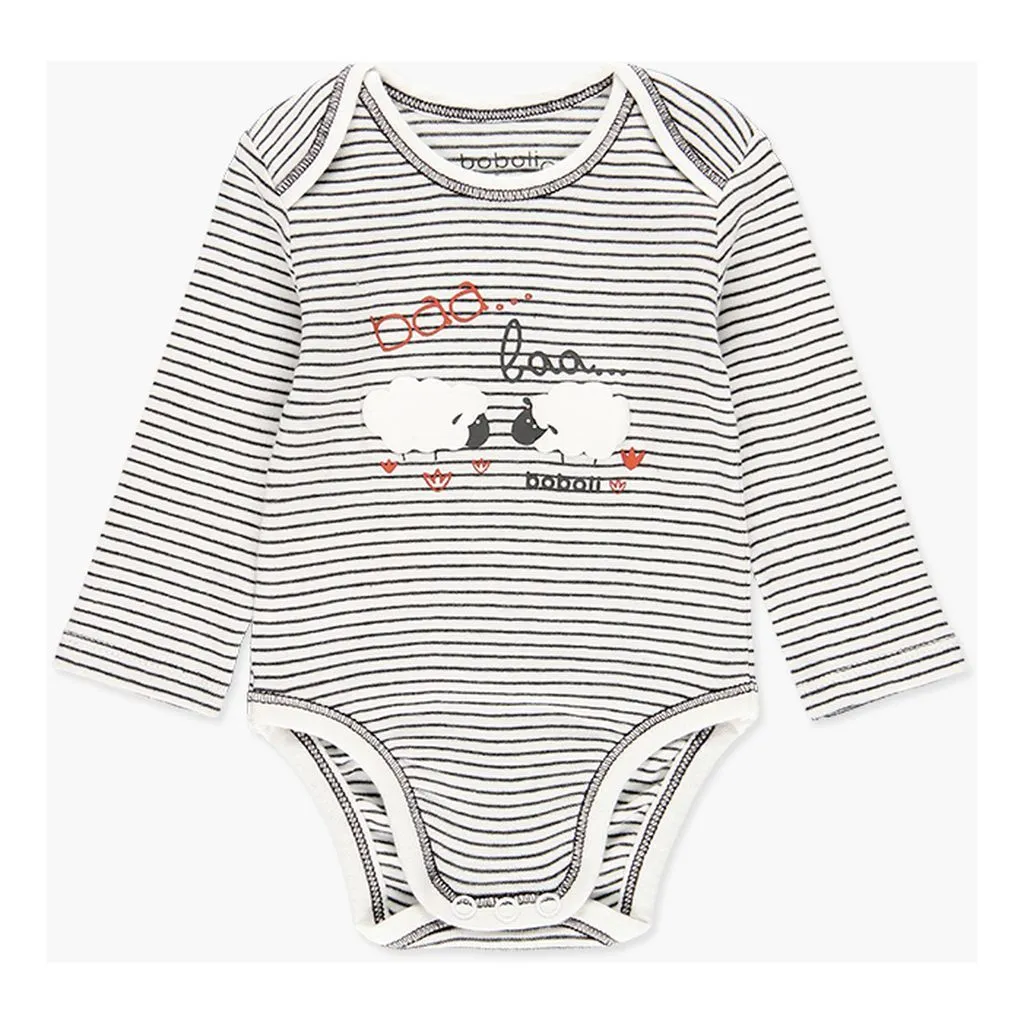 The first bodysuit features a timeless grey and white striped pattern, as well as a decorative multicolored print that adds a playful touch. It is equipped with a convenient hook fastening, making it easy to put on and take off, ensuring that dressing and diaper changes are hassle-free.