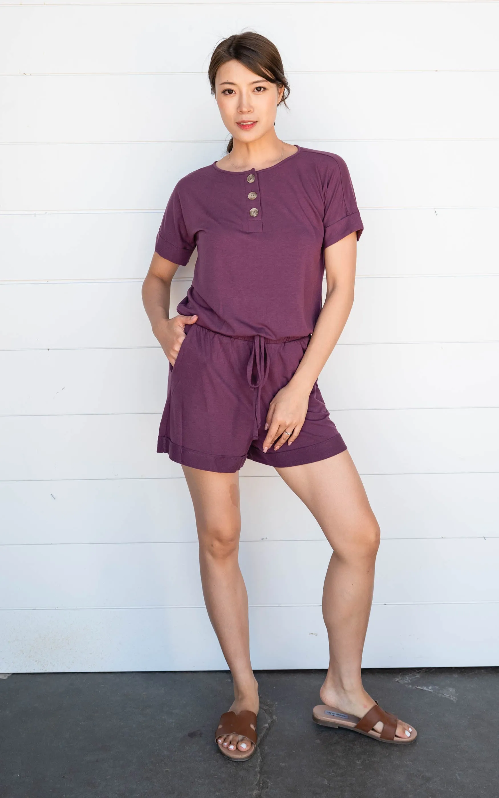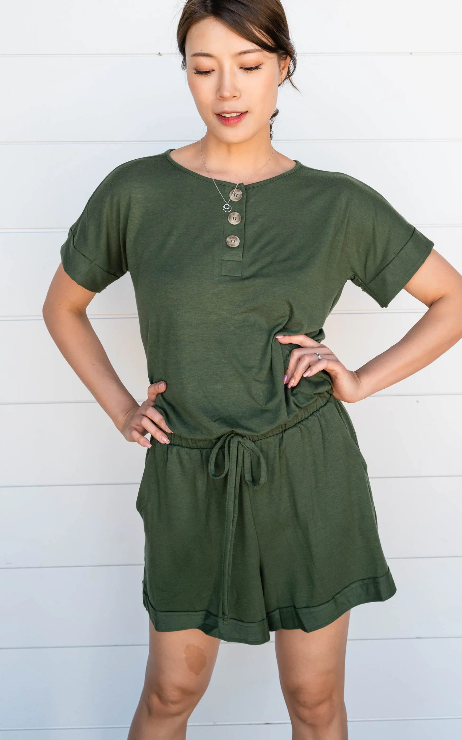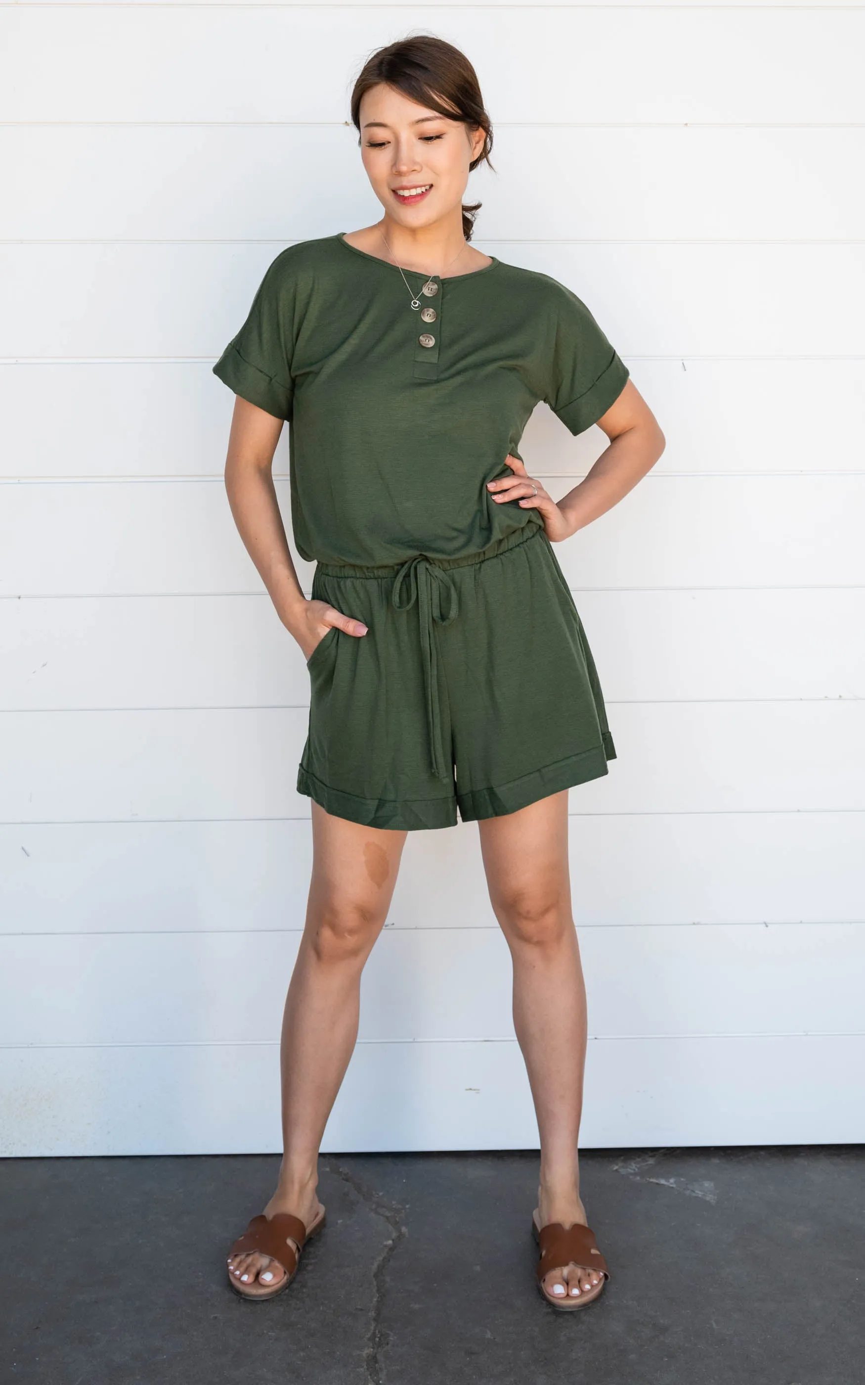 This simple solid romper is great for dressing up or just rocking it on the weekends. This romper has functional buttons, elastic waistband and hello did I mention pockets!