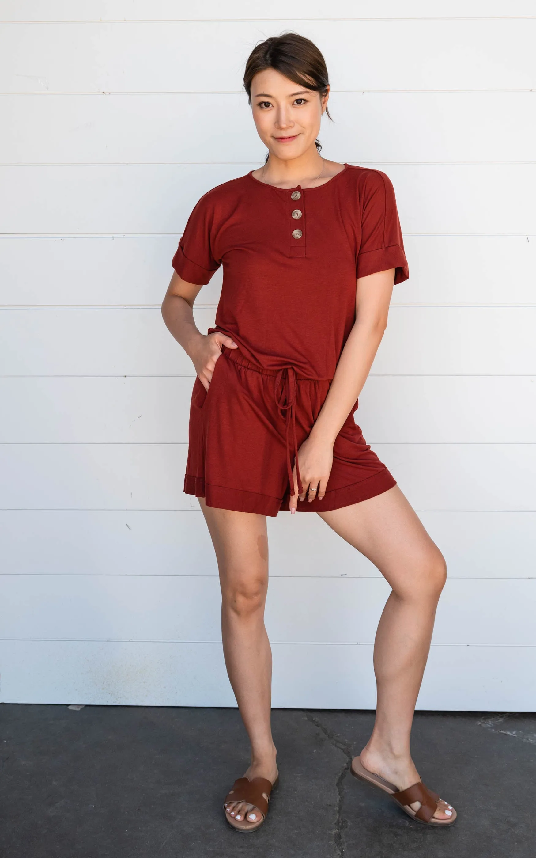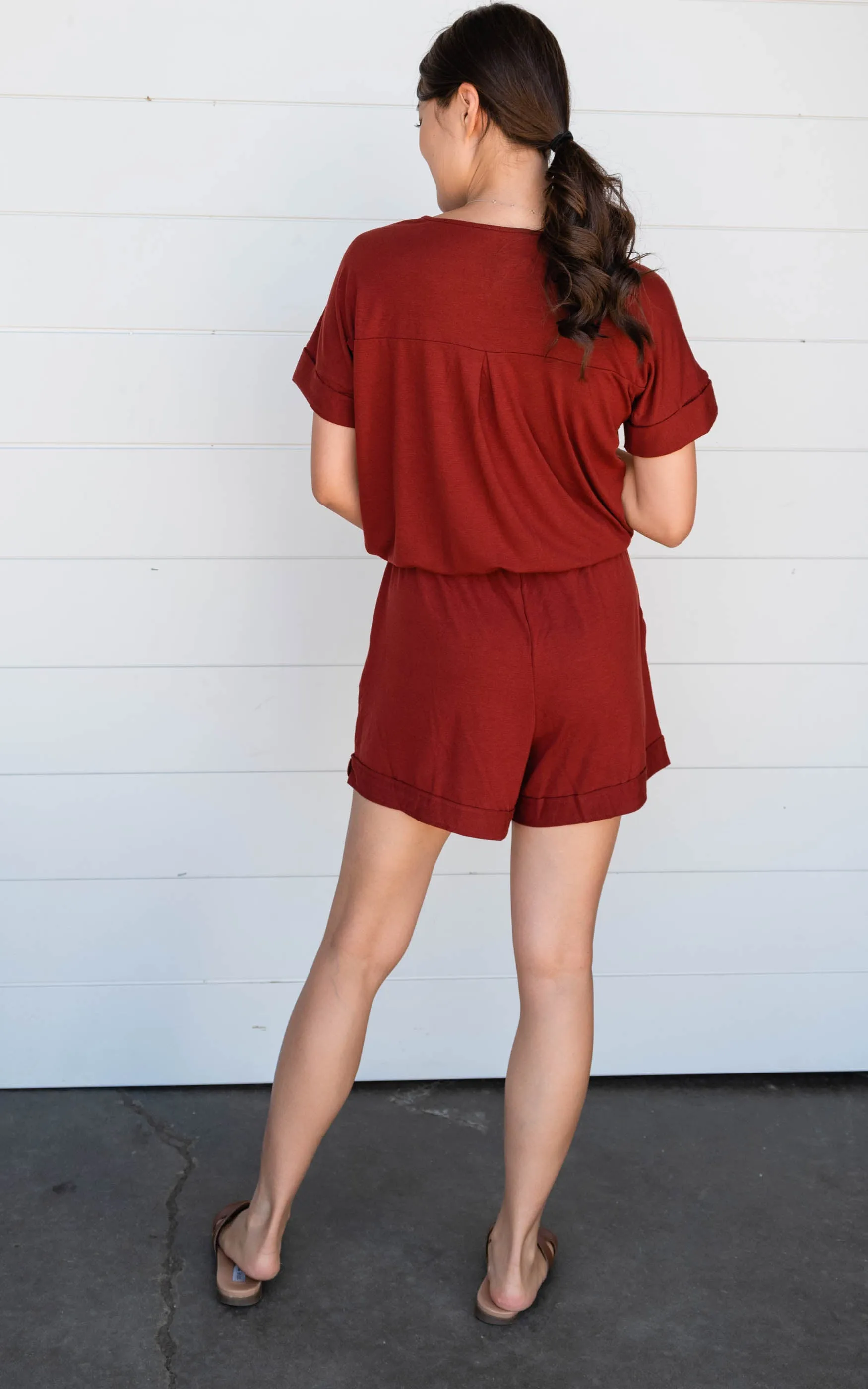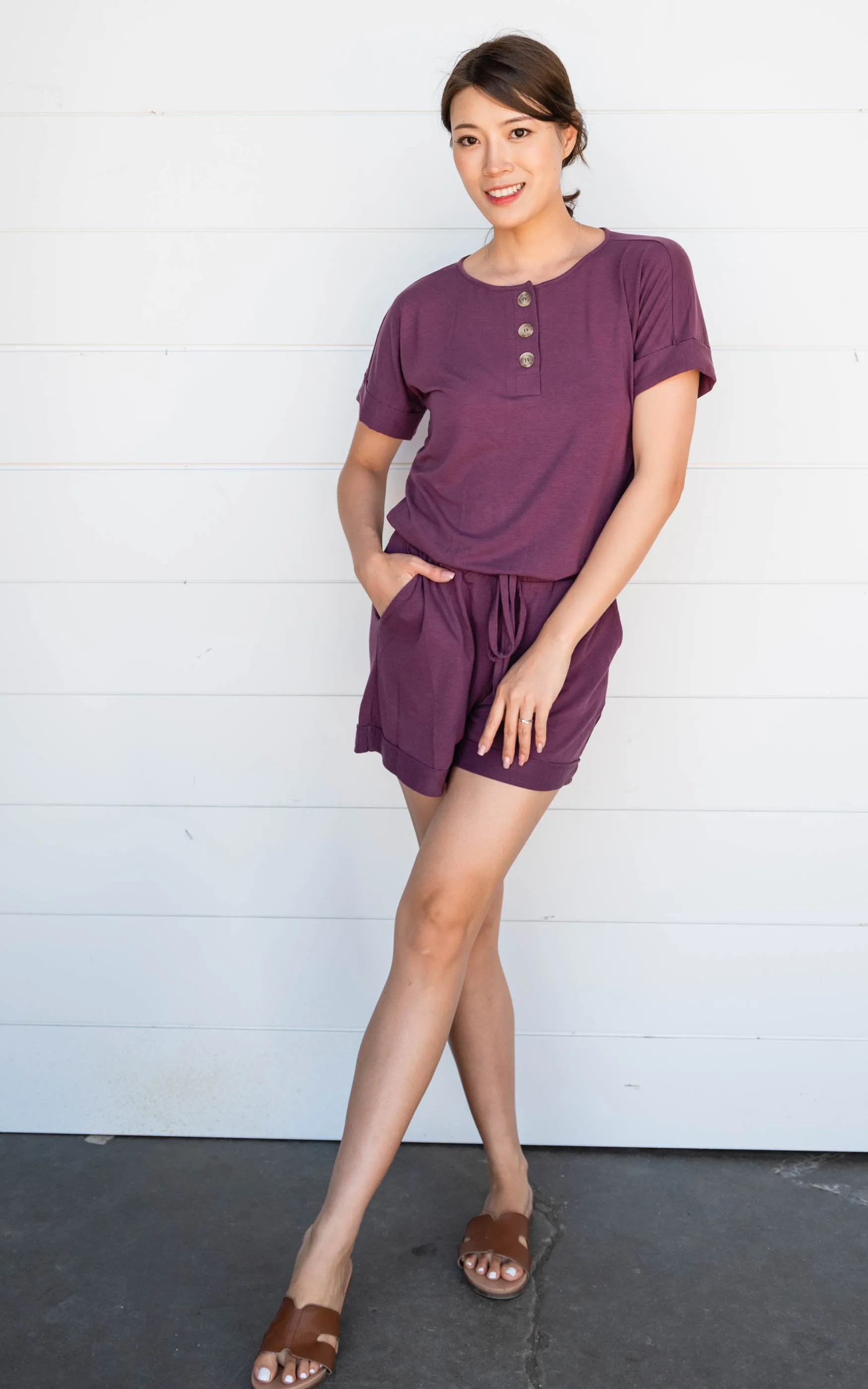 This simple solid romper is great for dressing up or just rocking it on the weekends. This romper has functional buttons, elastic waistband and hello did I mention pockets!