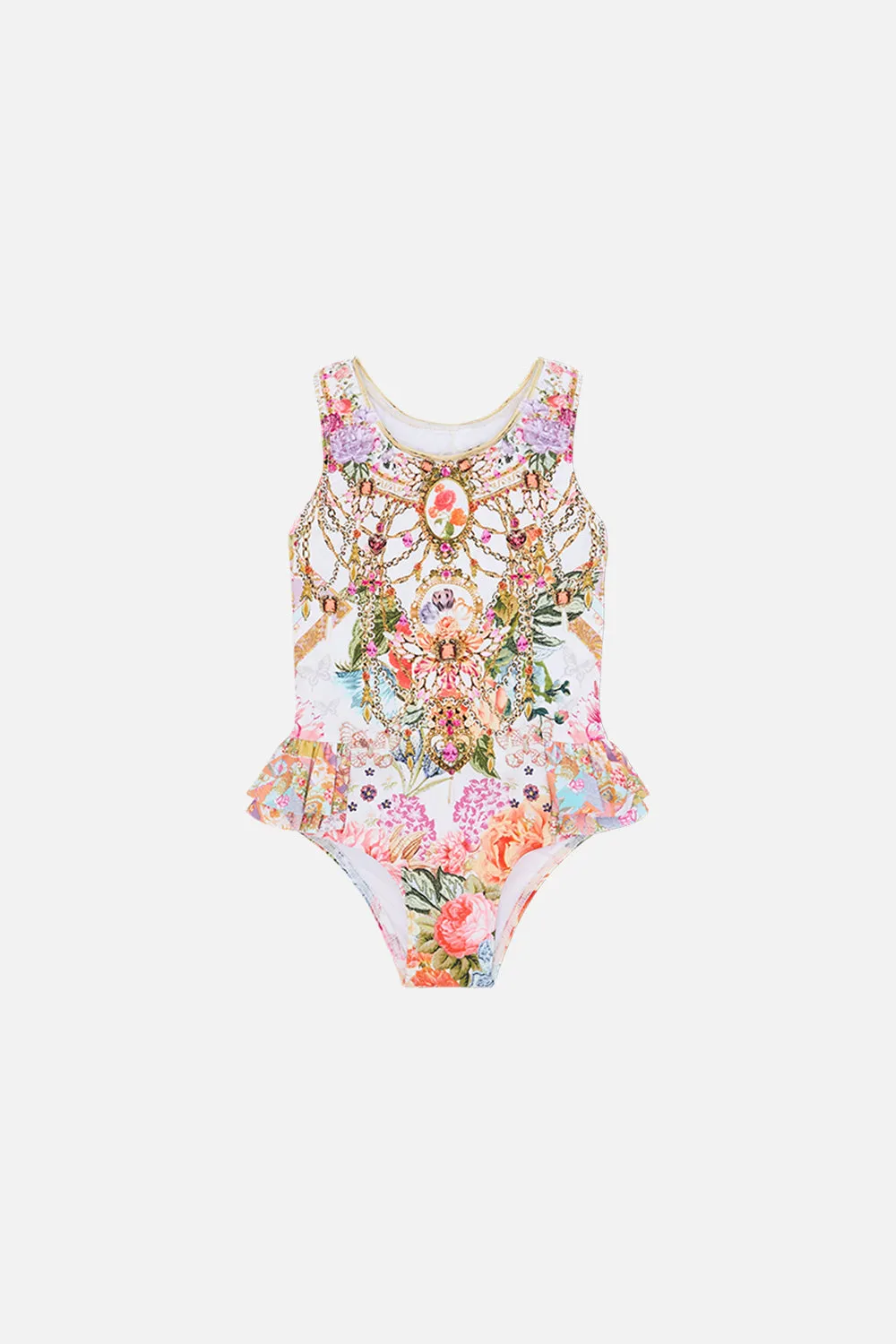 The Sew Yesterday Babies Ruffle Back One Piece wanders through a luscious garden of beautiful blooms adorned with delicate gold chains and captivating jewels. This beautiful kids swimsuit homes a fitted silhouette with a scoop neckline and adorable ruffle details upon the back. Explore more from the Wonderkind collection.