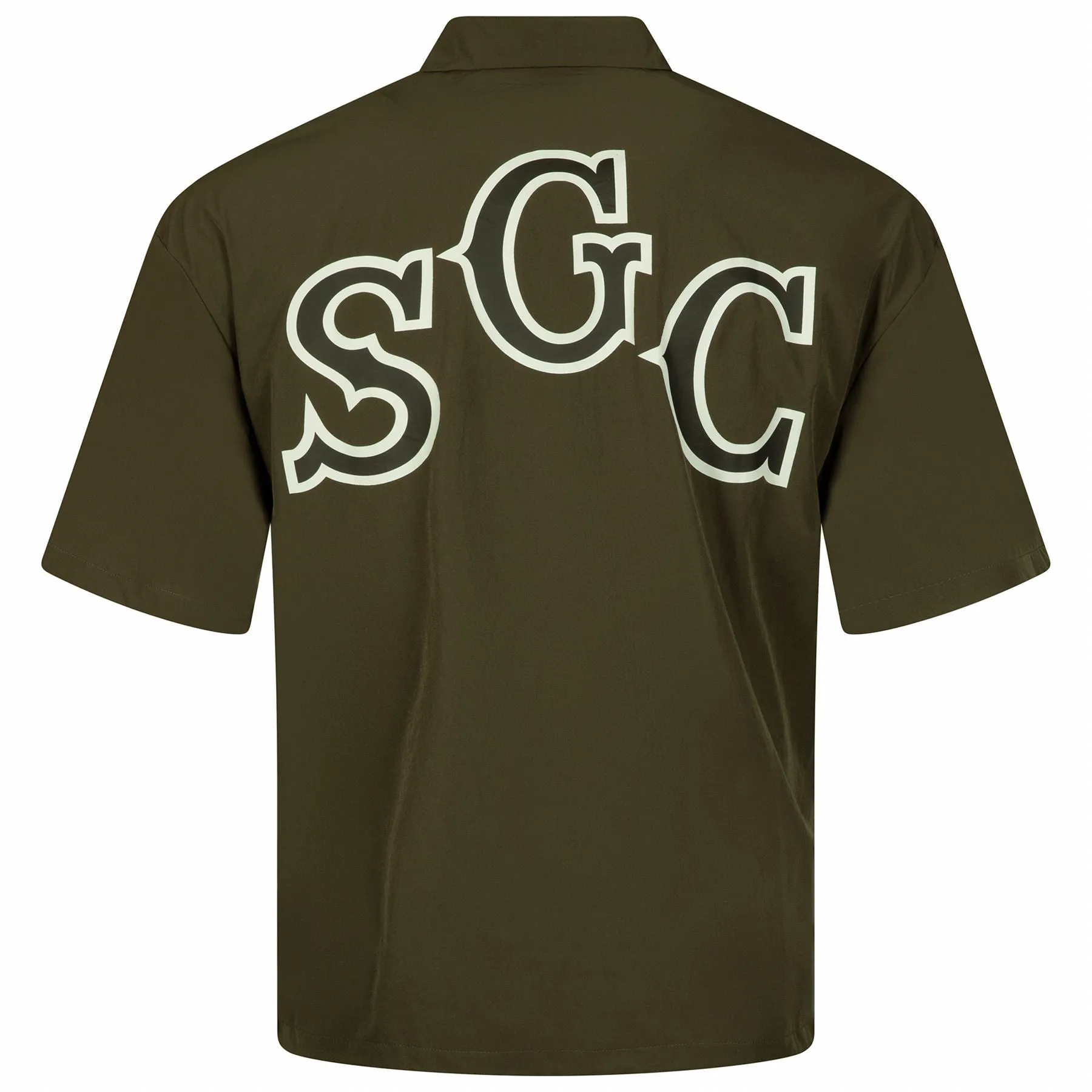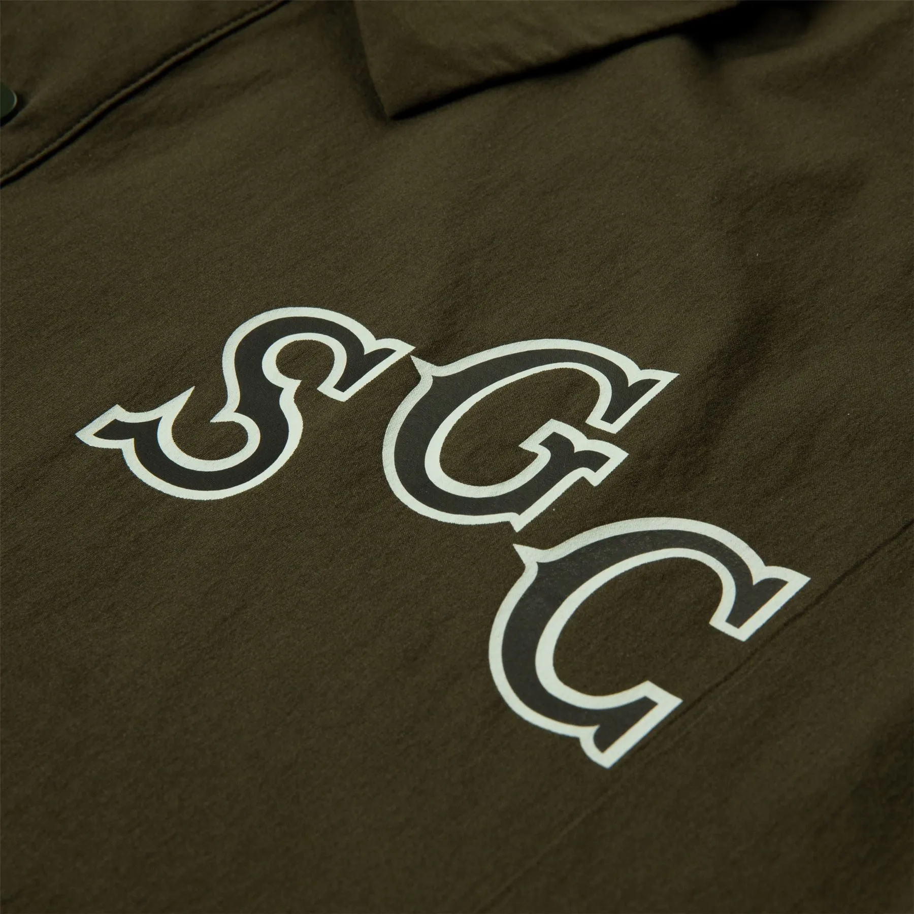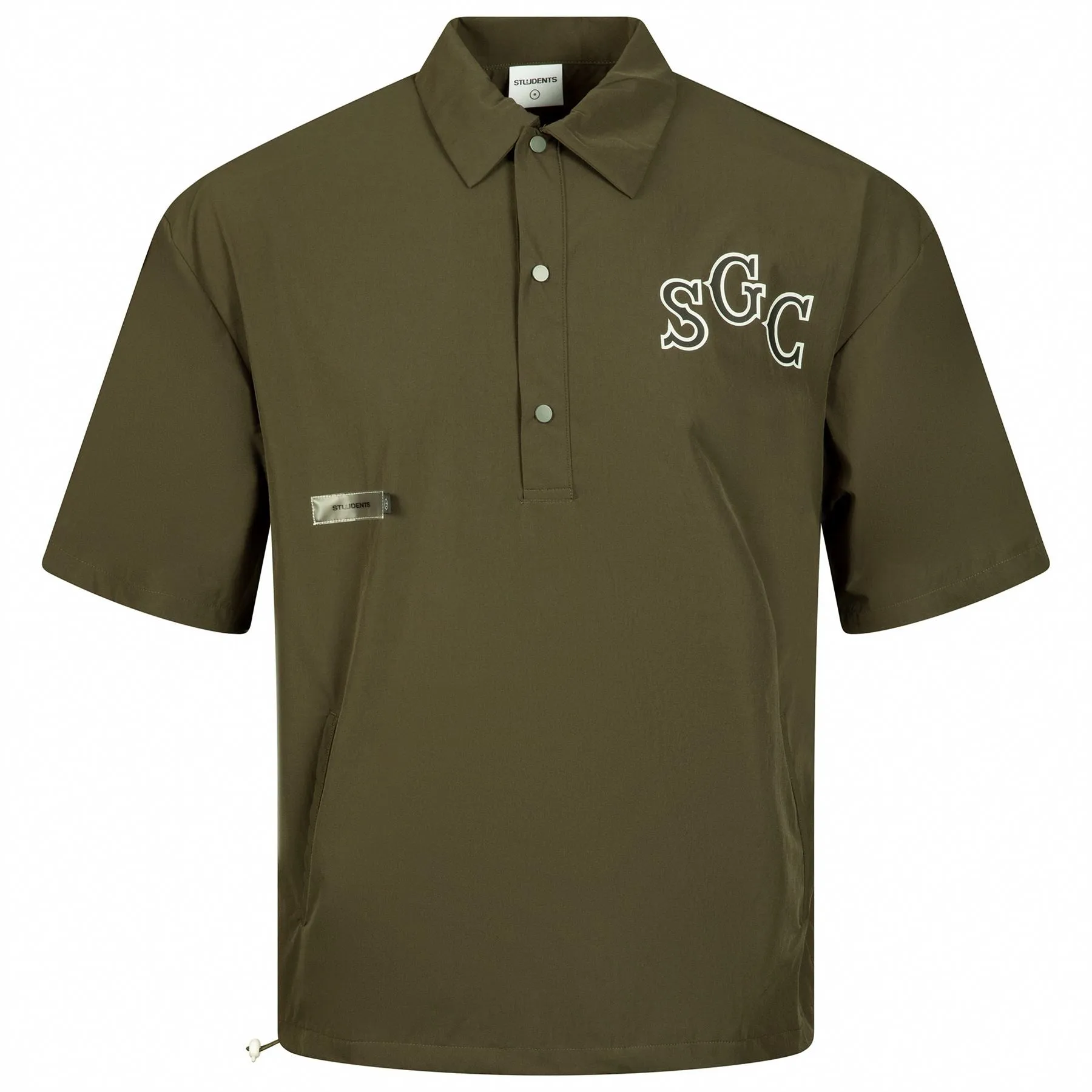 Stretchy nylon short sleeve popover jacket with front micro snap buttons closure, screen printed "SGC" logo on front and back, finished with signature clear poly label.