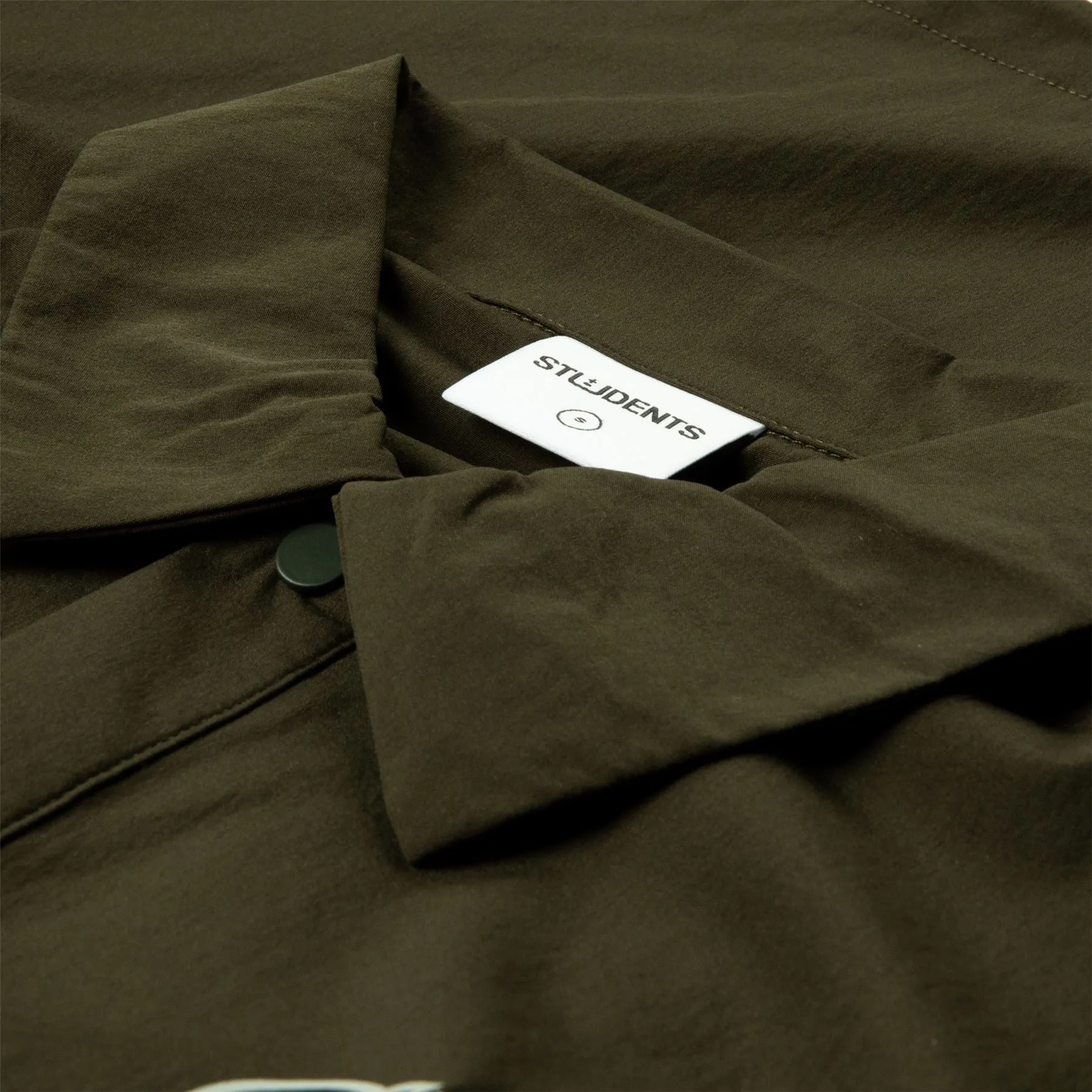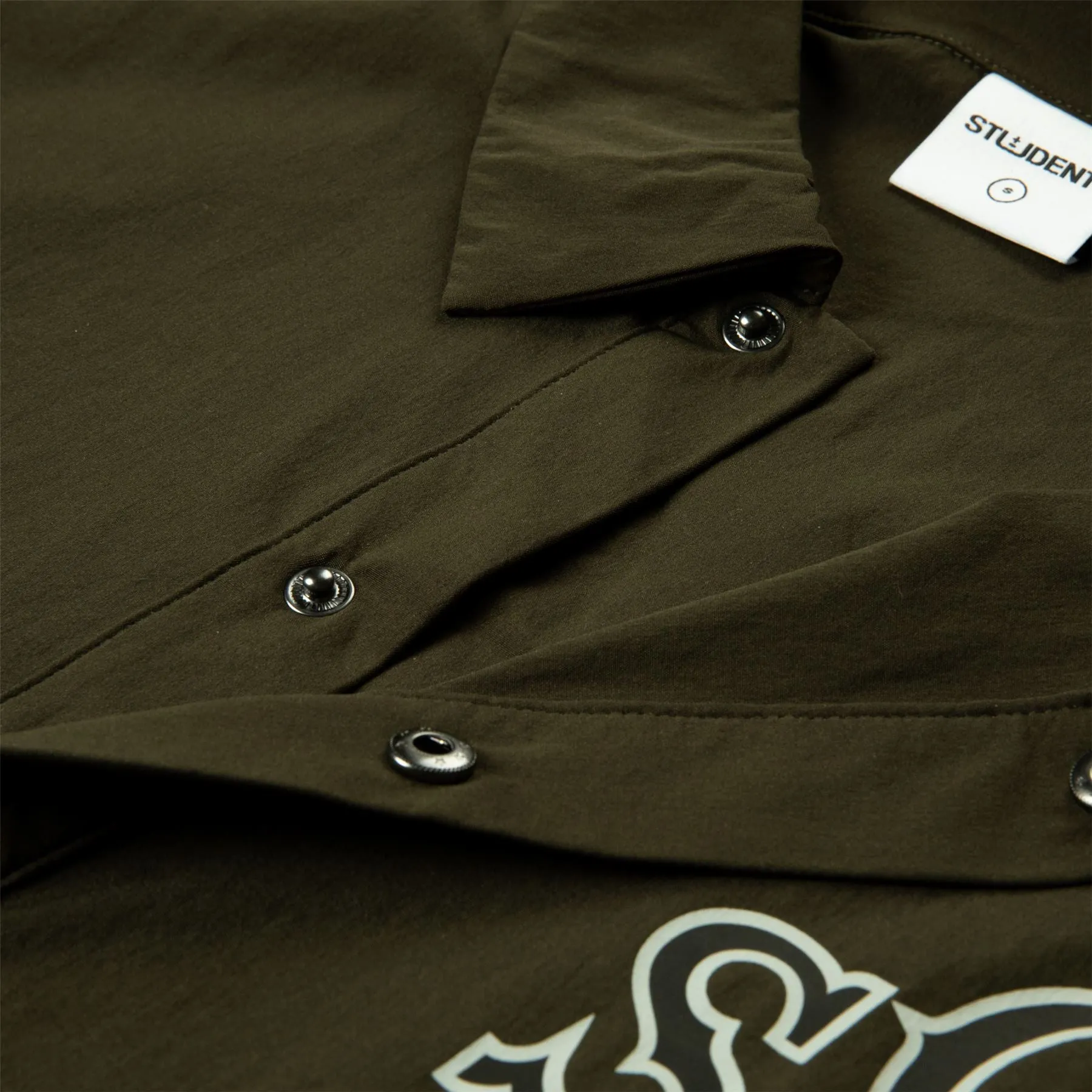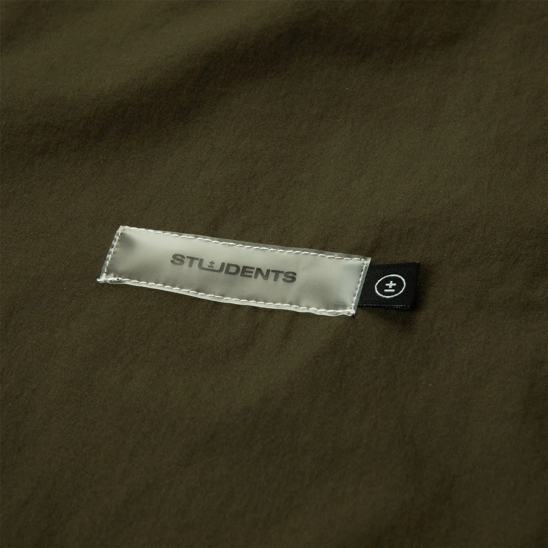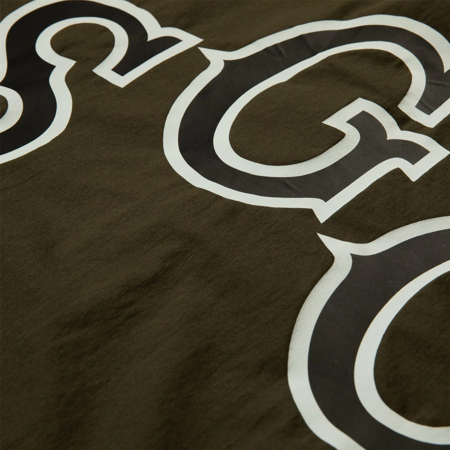 Stretchy nylon short sleeve popover jacket with front micro snap buttons closure, screen printed "SGC" logo on front and back, finished with signature clear poly label.