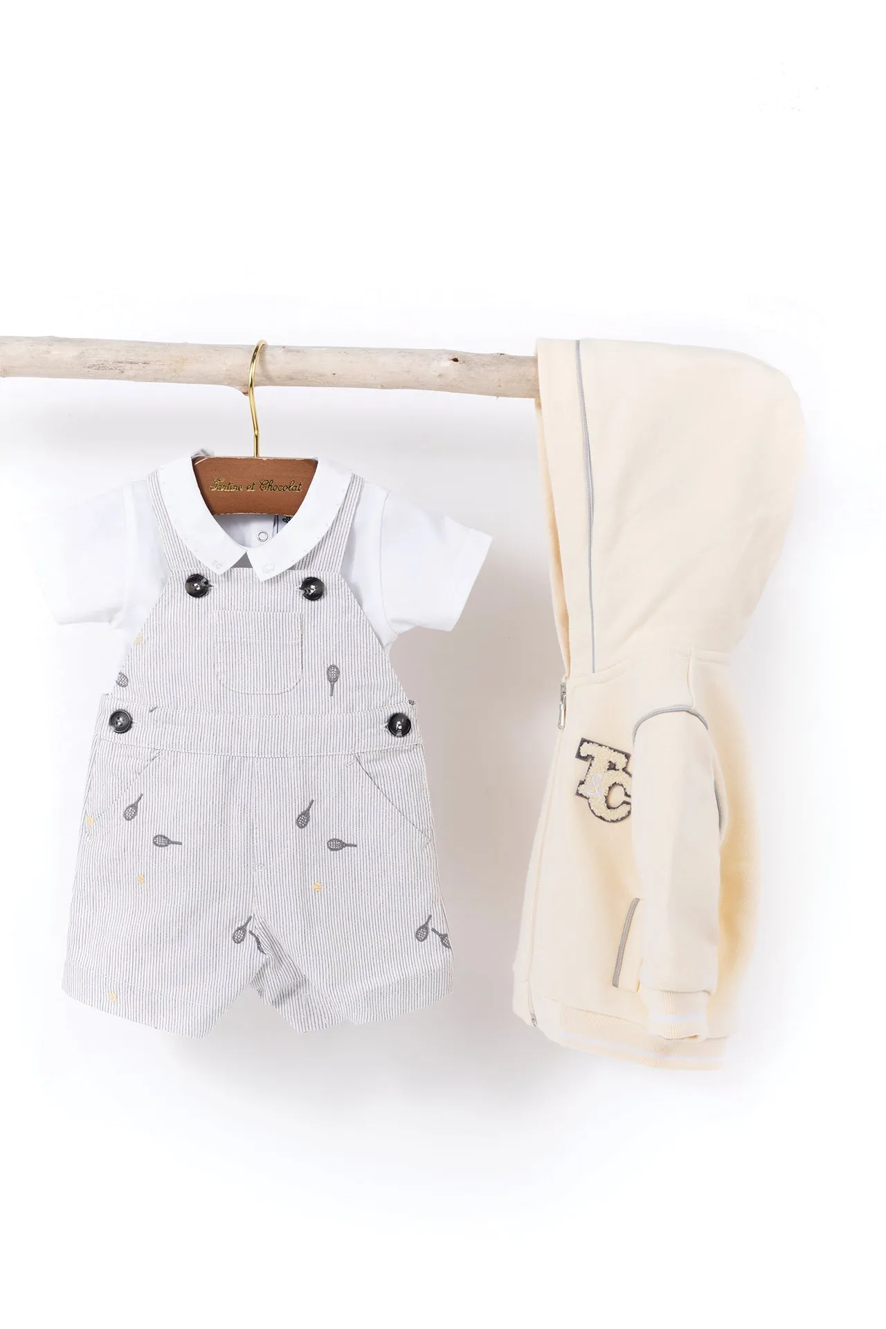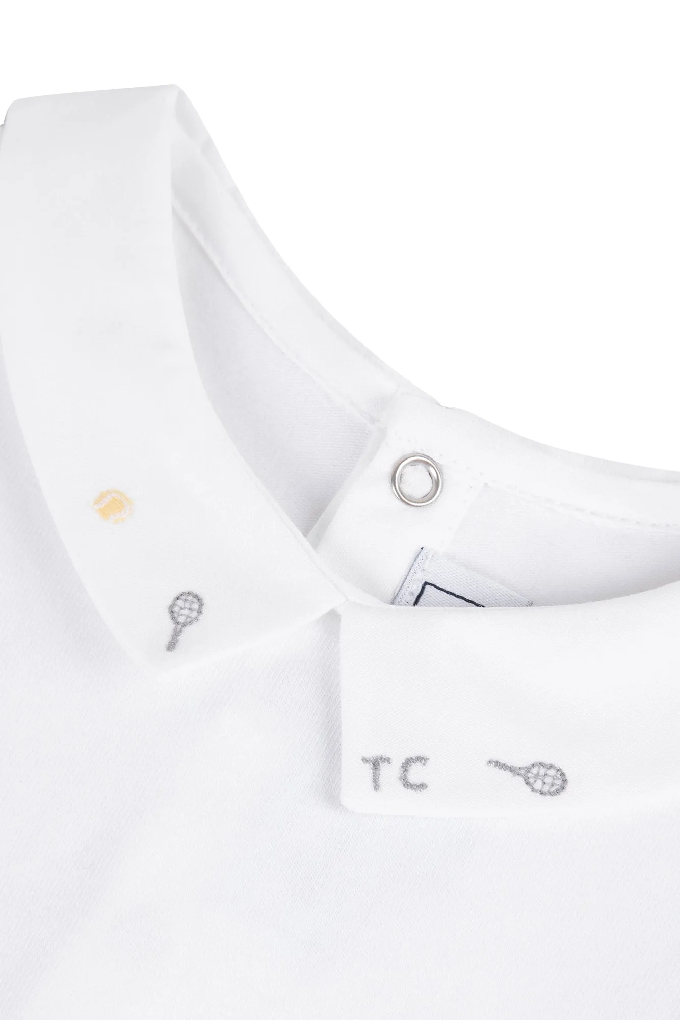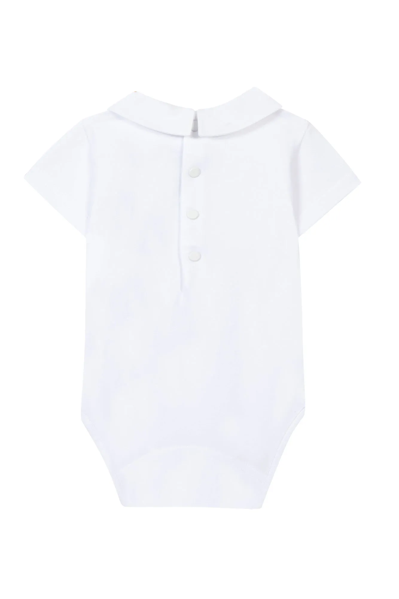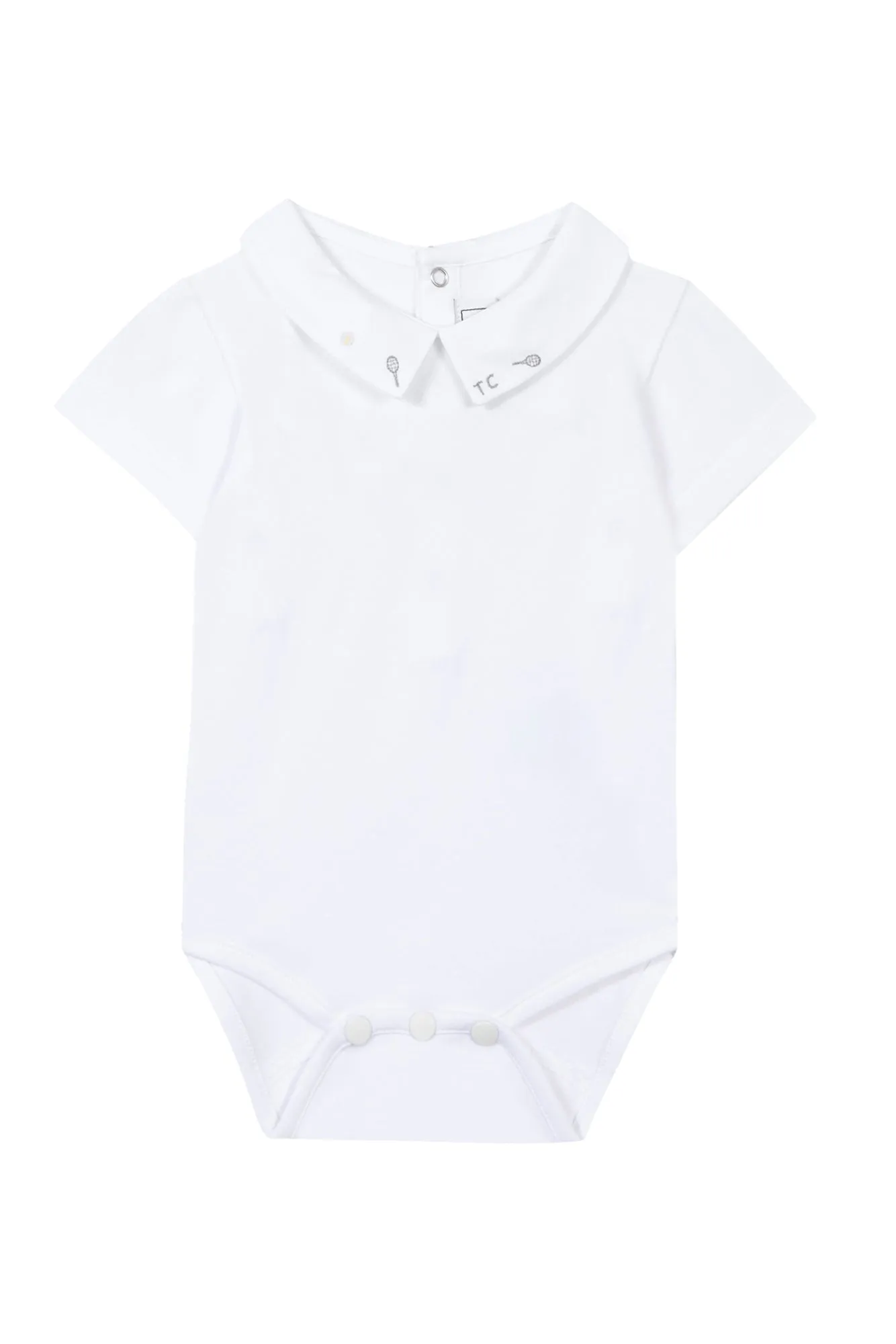 This soft body has a pointed collar and delicate embroideries that bring a modern and elegant touch to your little boy's outfit. The body is endowed with snap buttons on the back and crotch to facilitate dressing. Perfect for everyday wear, we love to match it with a dungaree!