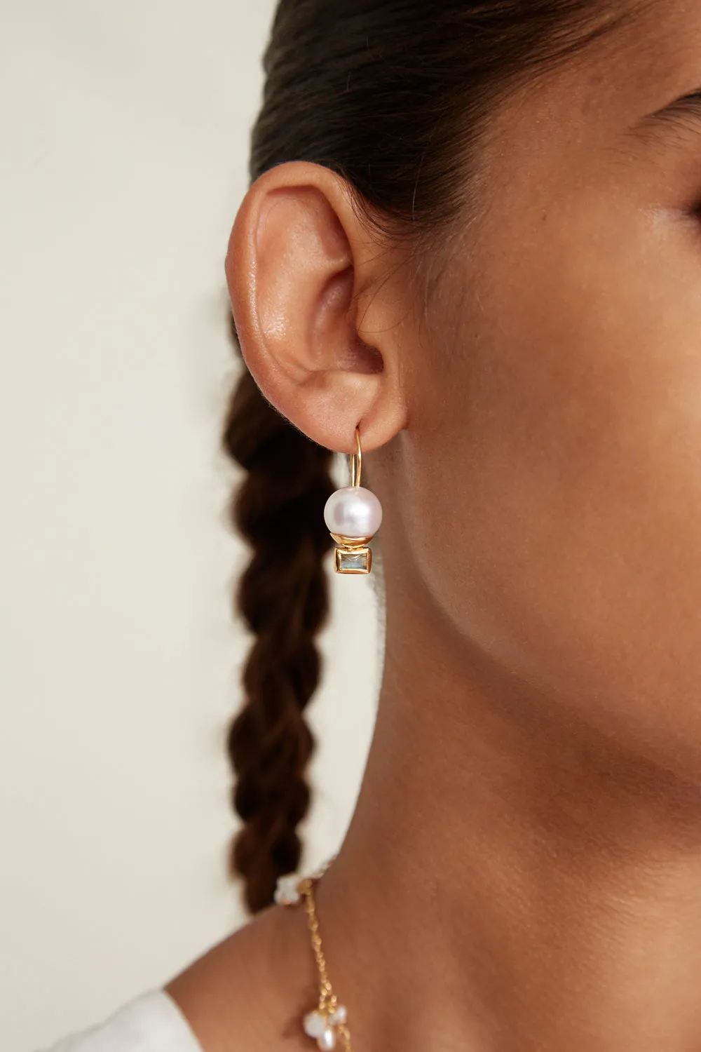 - 18k gold plated sterling silver, white freshwater potato pearls, labradorite.