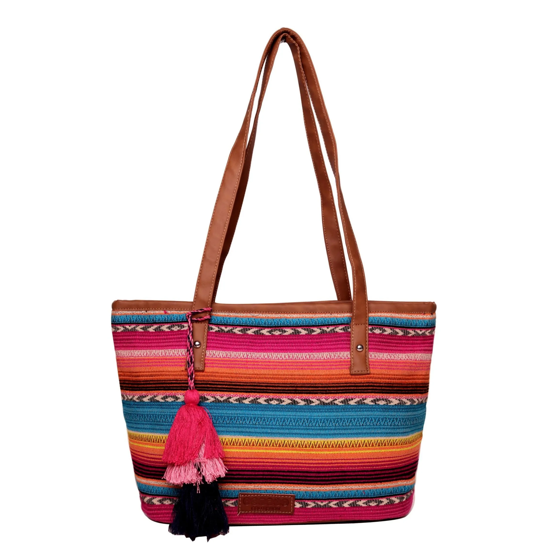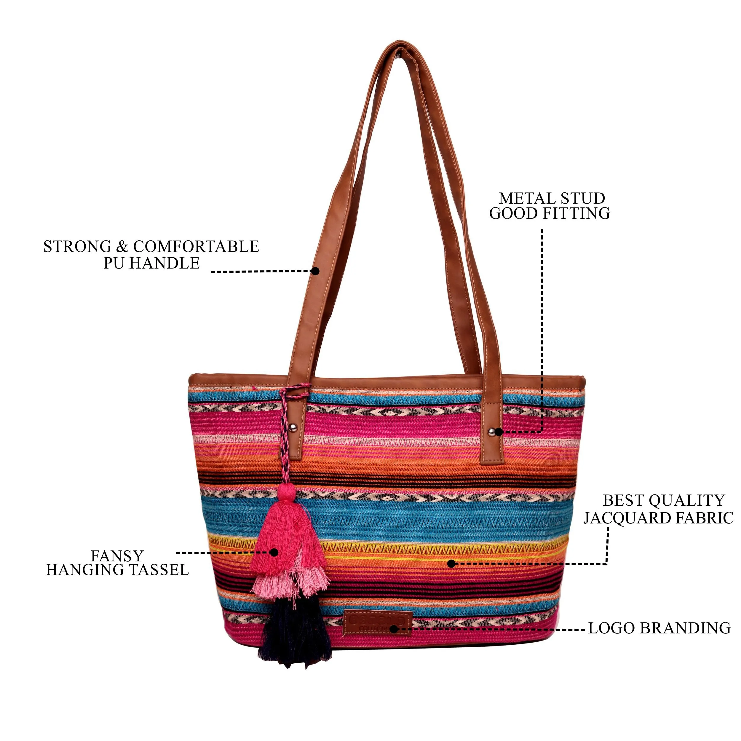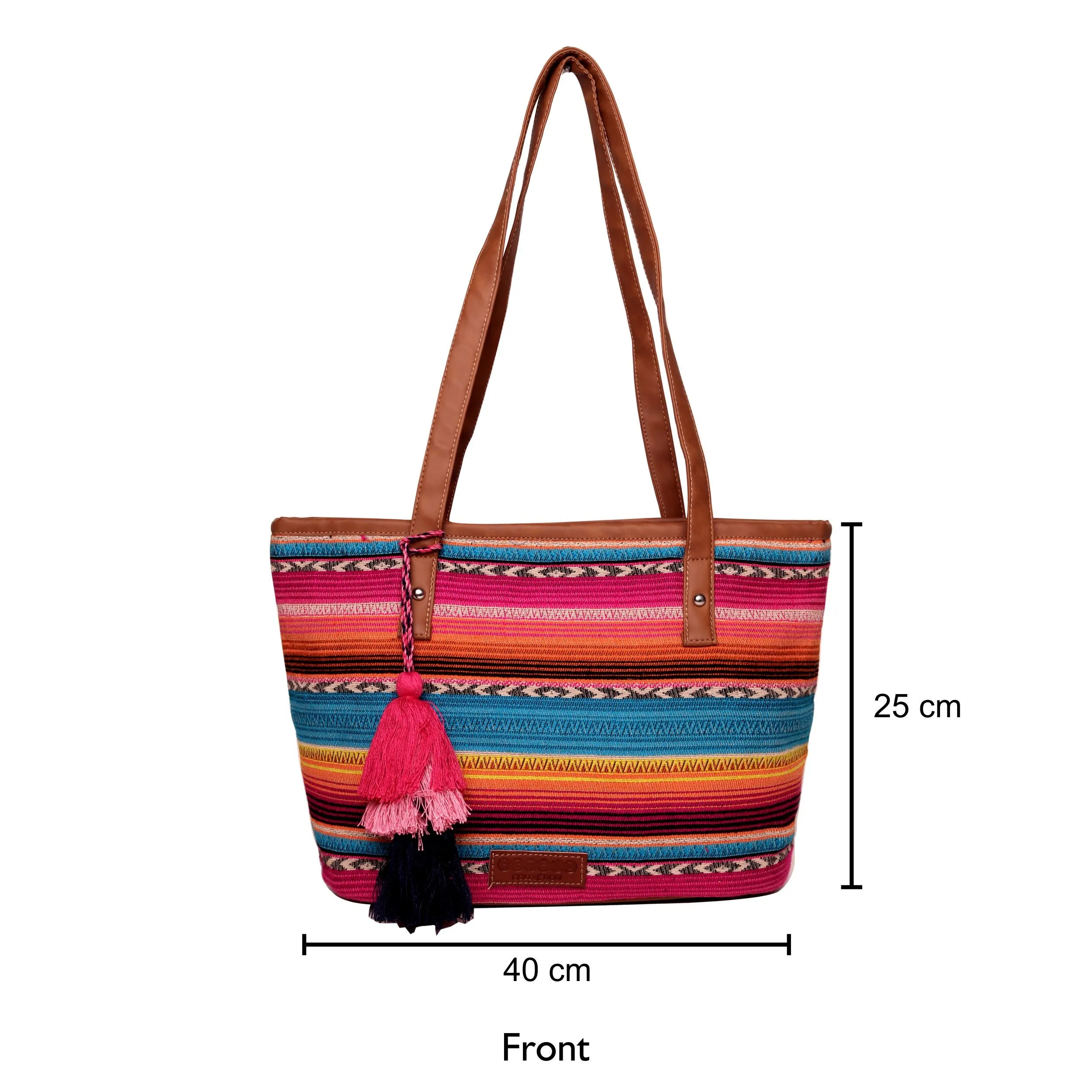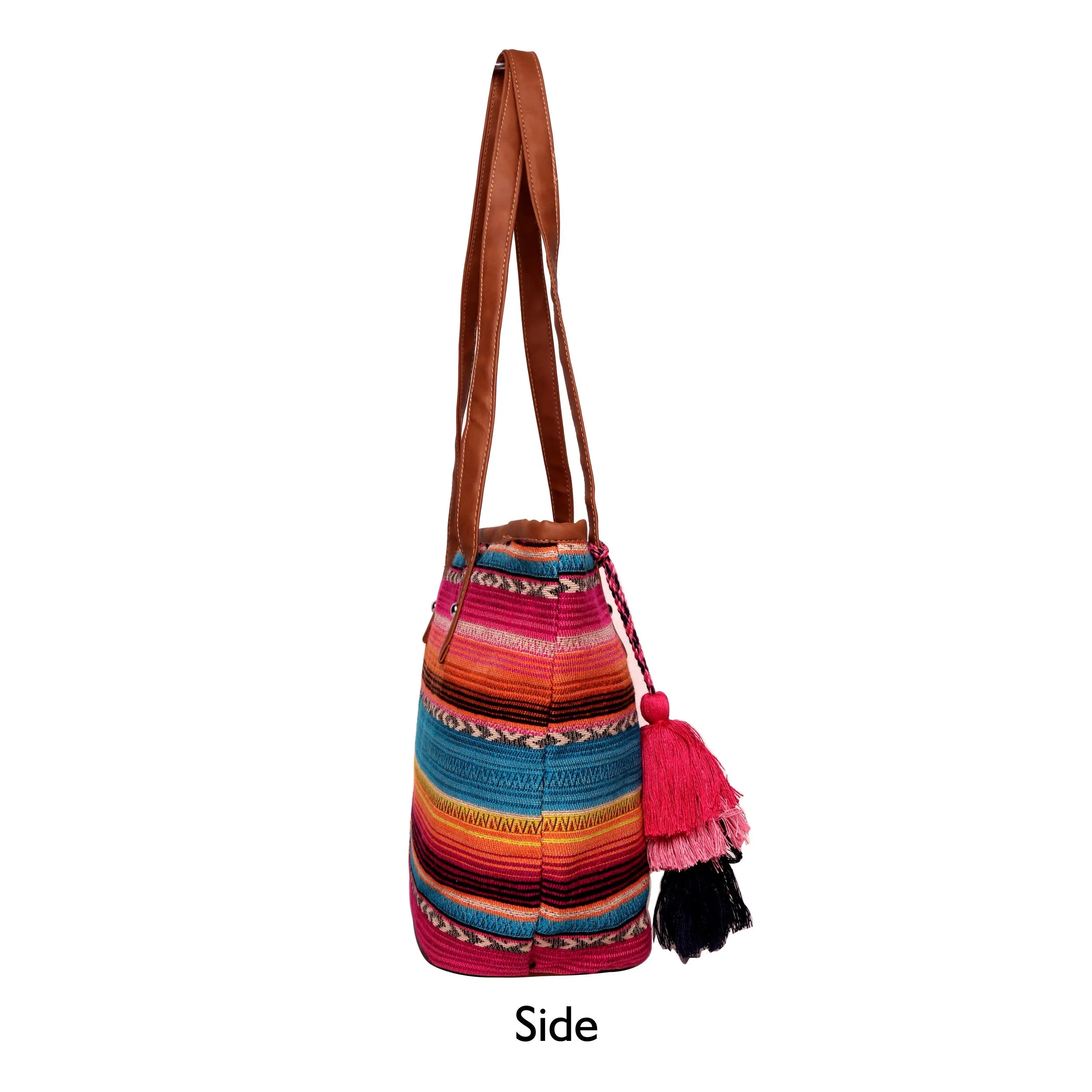 Beautiful Multi color stripe pattern jacquard, high quality Pu shoulder strap handles, Handmade multi color thread tassel, zip top closure, Inside polyester lining, inside zipper for holding small items.