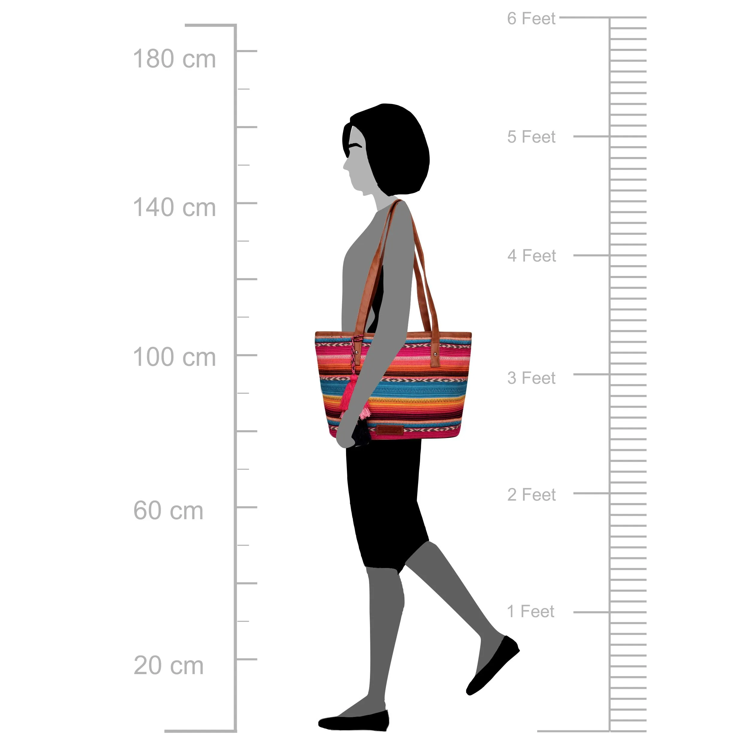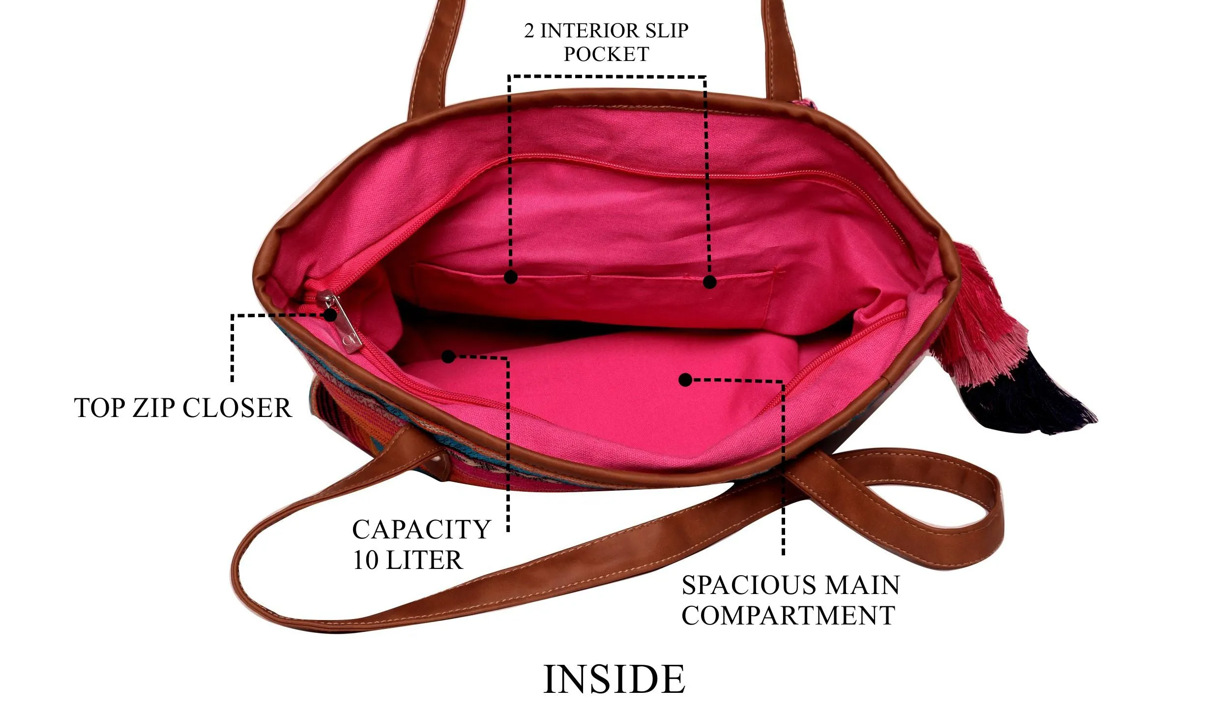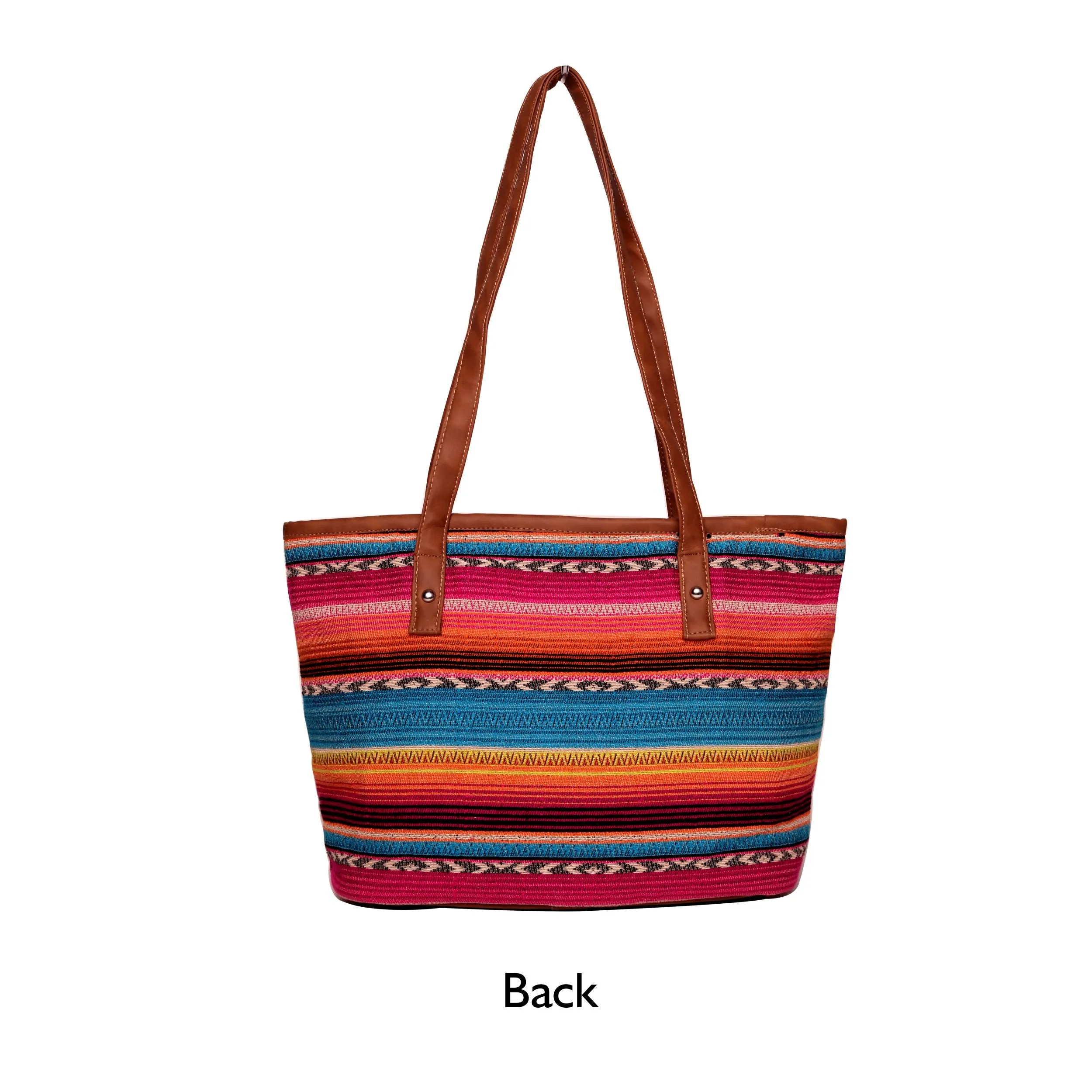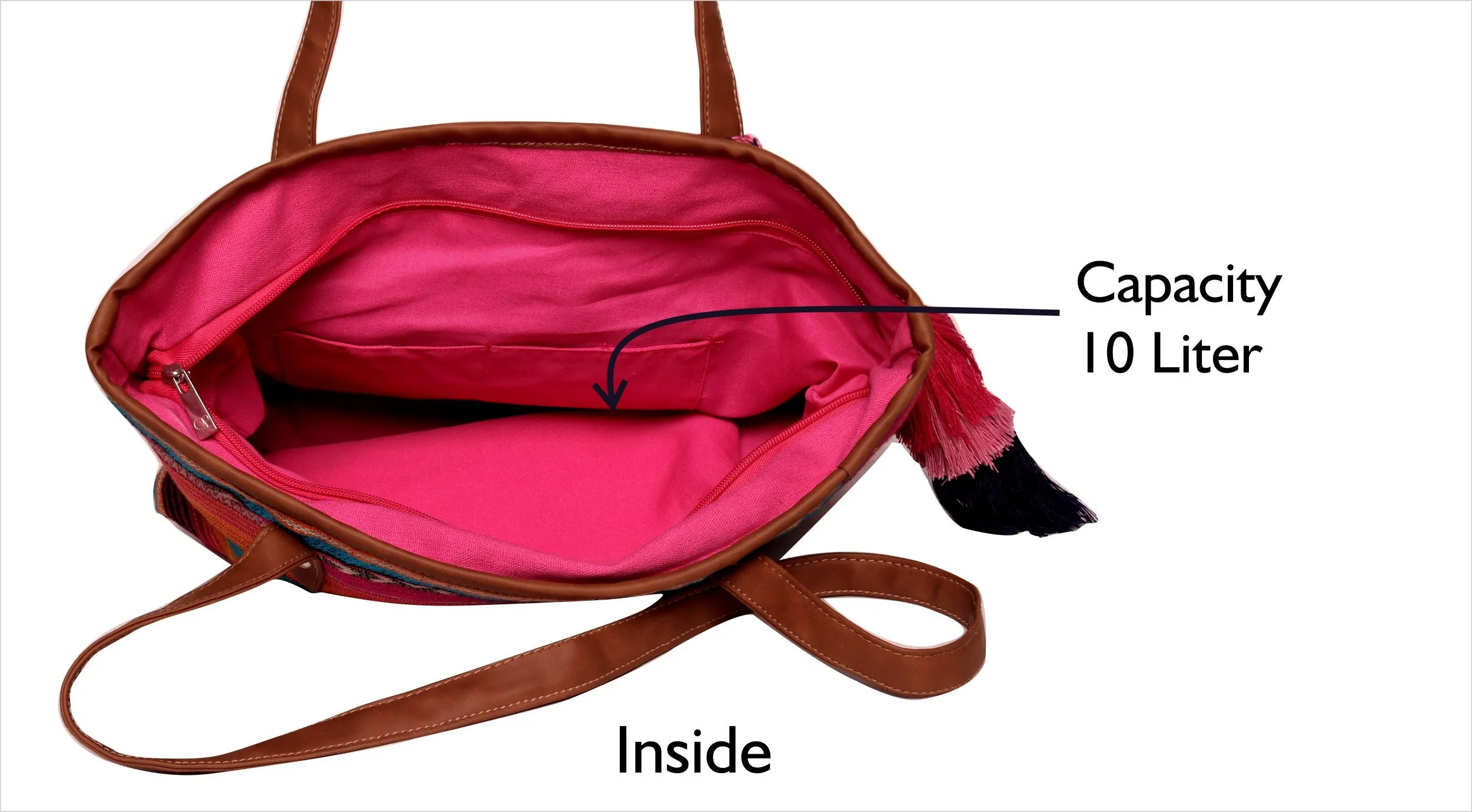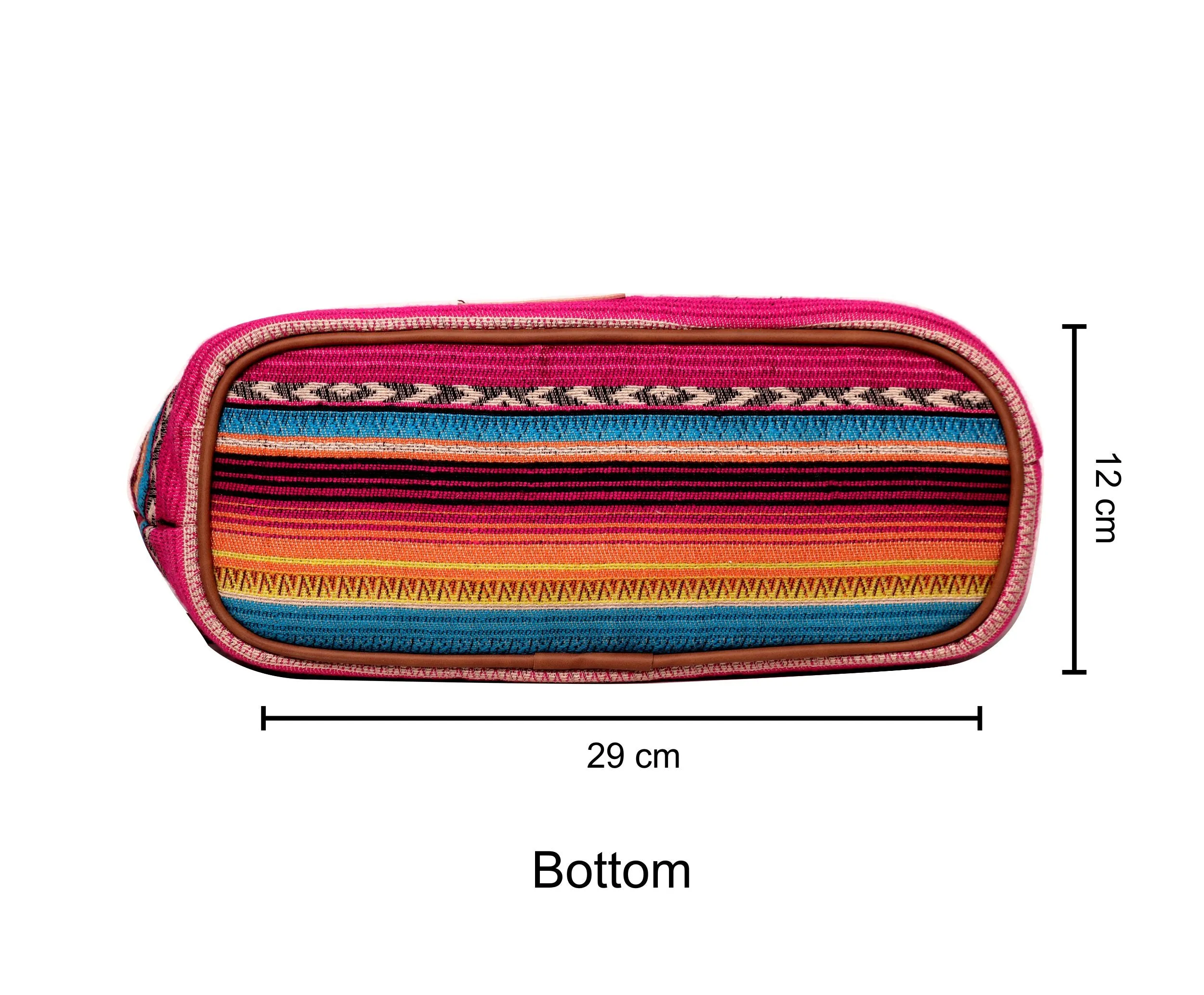Beautiful Multi color stripe pattern jacquard, high quality Pu shoulder strap handles, Handmade multi color thread tassel, zip top closure, Inside polyester lining, inside zipper for holding small items.