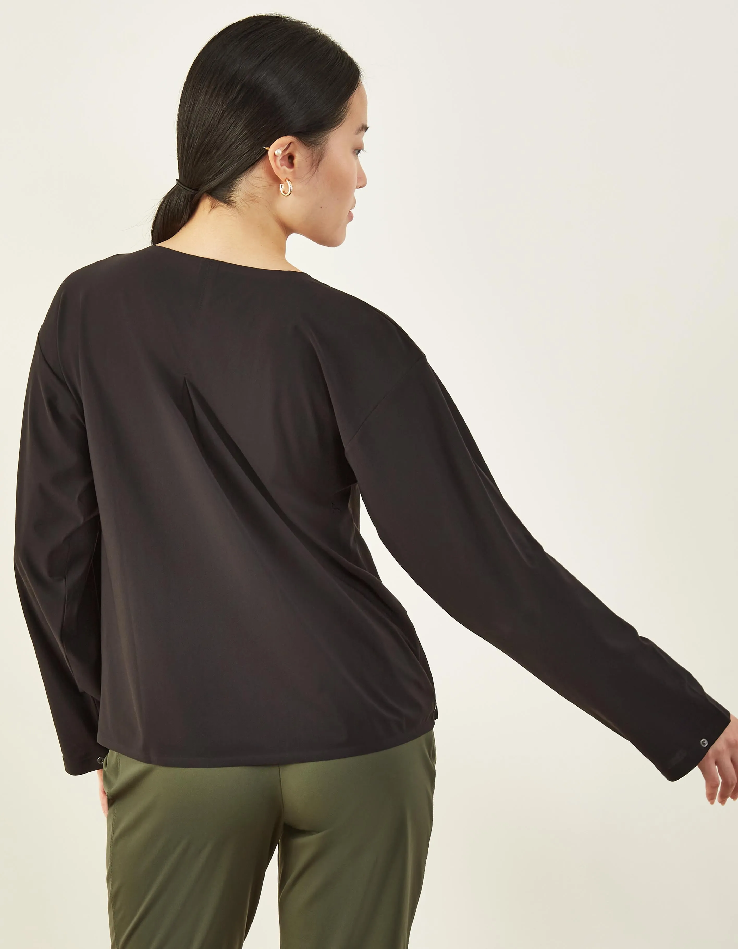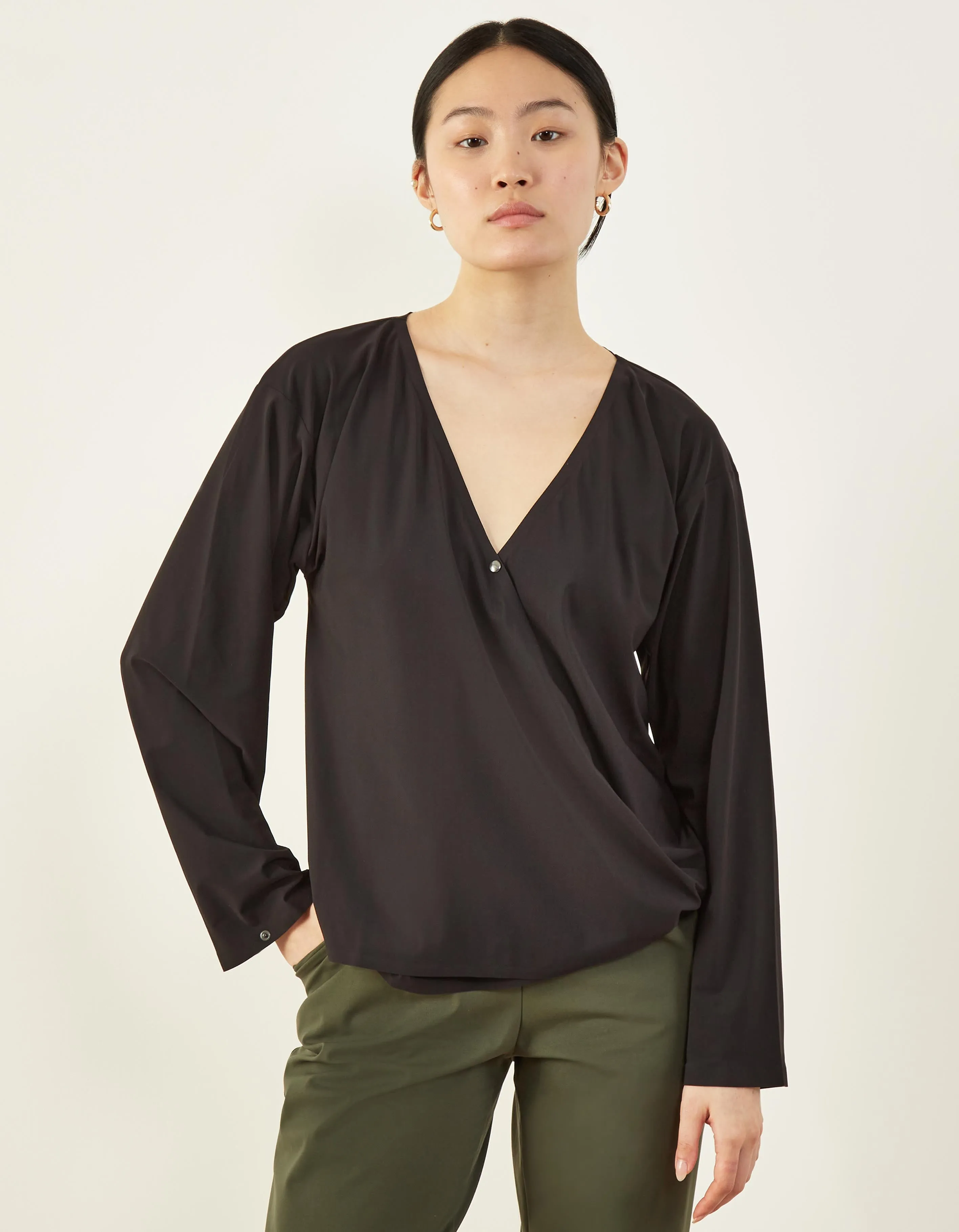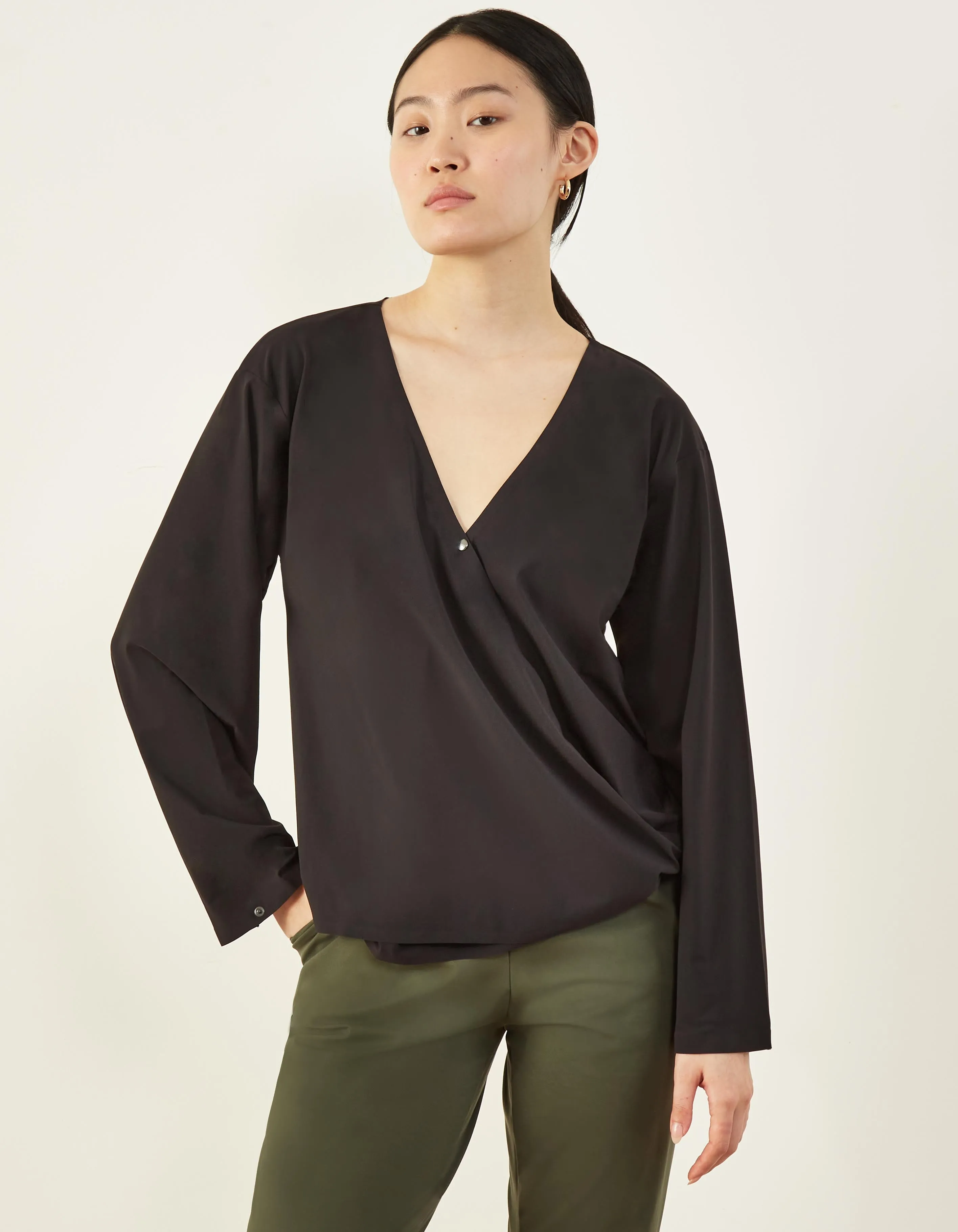 Versatile and universally flattering, our loose fitting wrap blouse can be tied, draped, snapped and wrapped multiple ways. This product runs large. We recommend sizing down.